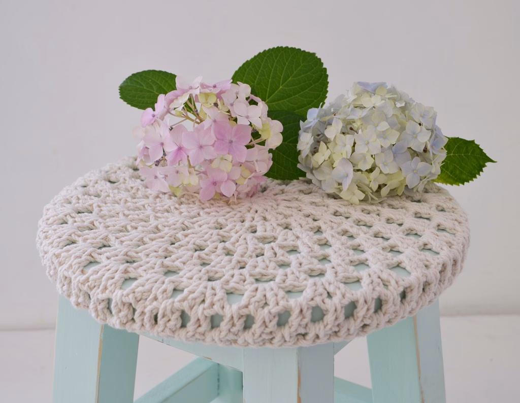 Para salir de la versión original pasamos del cuadrado al redondo, con base mint y crochet color natural. Y hortensias para la foto (avisé hace tiempo que iba a llenar mis redes de hortensias! el que avisa no traiciona! 🙂