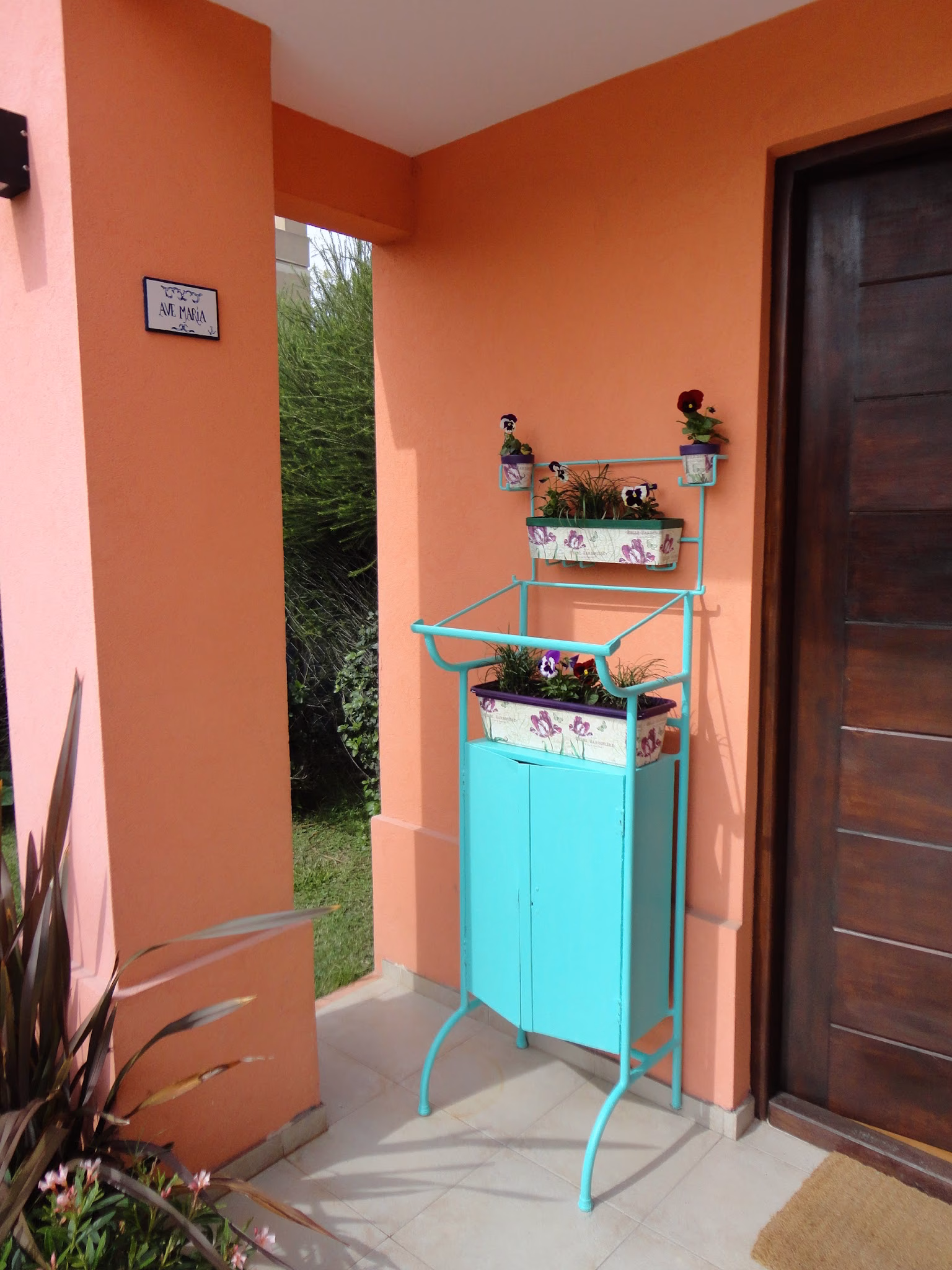 Estuvo mucho tiempo al aire libre, super oxidado! pero se le veía potencial y aceptamos el regalo. Después de lijar a full, mano de antióxido y pintura colorida… ya estaba listo! Sólo quedaba sumarle unas macetas decoradas con découpage. Colores acquas+violetas… y pasto inglés y violas del vivero amigo!