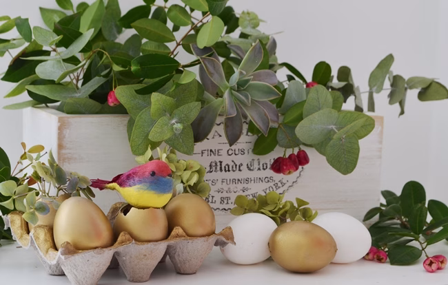 Los huevos son infaltables, por lo que guardé los del flan del domingo, y los pinté con aerosol dorado. En la misma huevera o pedacito de maple: primero una mitad, después la otra… quedan perfectos y la huevera queda con un toque lindo también 🙂 A algunos los rompí un poquito para apoyar un pajarito comprado alguna vez en el Barrio Chino y unos ramitos de hortensias… y ya está! Justo los frutitos morados compensan y acompañan el color del pajarito (a falta de un lindo conejito!)