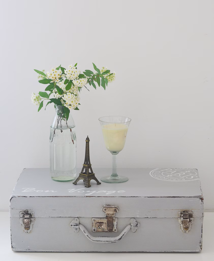 La valijita es divina, muy parecida a una que tengo en casa y por el lugar donde va a ir ubicada, decidimos pintarla de gris claro con inscripciones en blanco. Quedó super delicada!