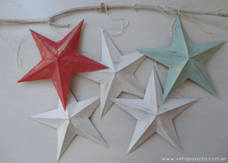 Le hice un agujerito a cada estrella con una aguja con hilo que luego usé para atarlas a una ramita que pinté de blanco y también patiné… Y listo!