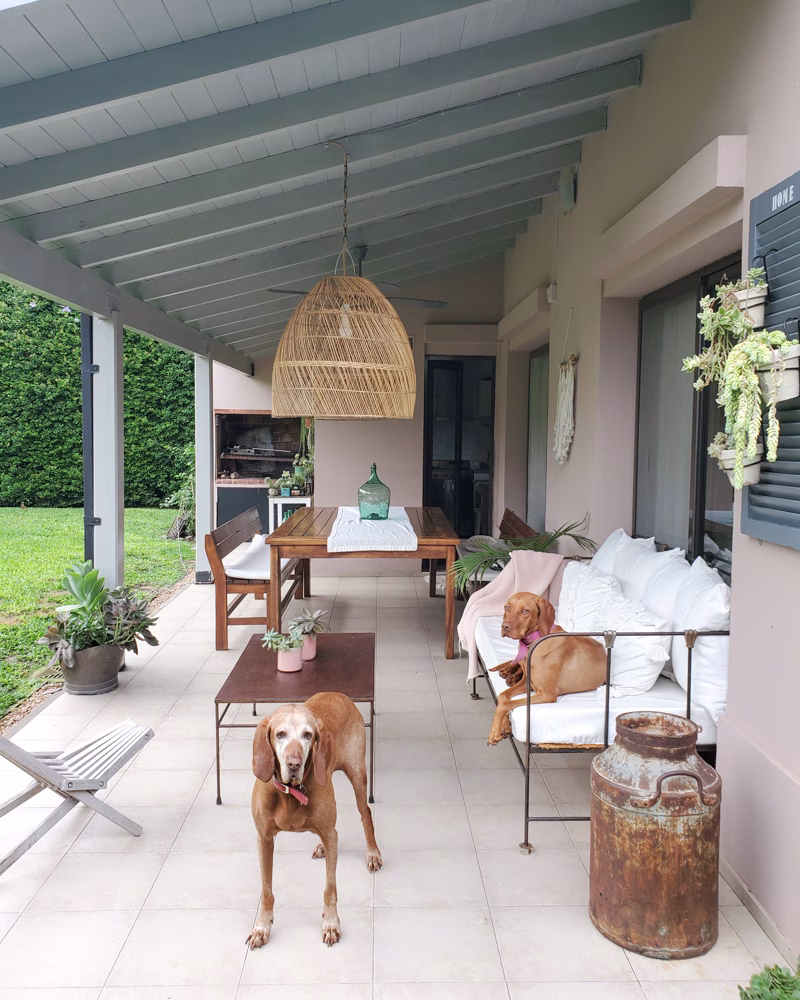 Este espacio es uno de los que más usamos de la casa y en todos estos años hemos hecho modificaciones pero más que nada centrados en muebles, textiles, objetos. El techo es el original y lo que nos venía haciendo ruido hacía rato es el color que le dieron a la madera, muy muy oscuro. Evaluamos lavarlo, pero además de ser un trabajo enorme en altura, la madera de abajo es pino con lo cual también implicaba después dar con un buen entonado, o patinarla o… Sumado a eso, el año pasado cambiamos las columnas que sostienen la estructura, y ahí se nos sumó otro color de madera que nada que ver. Y por supuesto, no lo queríamos unificar a oscuro! Así estuvimos, mucho tiempo, pensando diferentes posibilidades. Hasta que nos agarró la cuarentena, en casa.