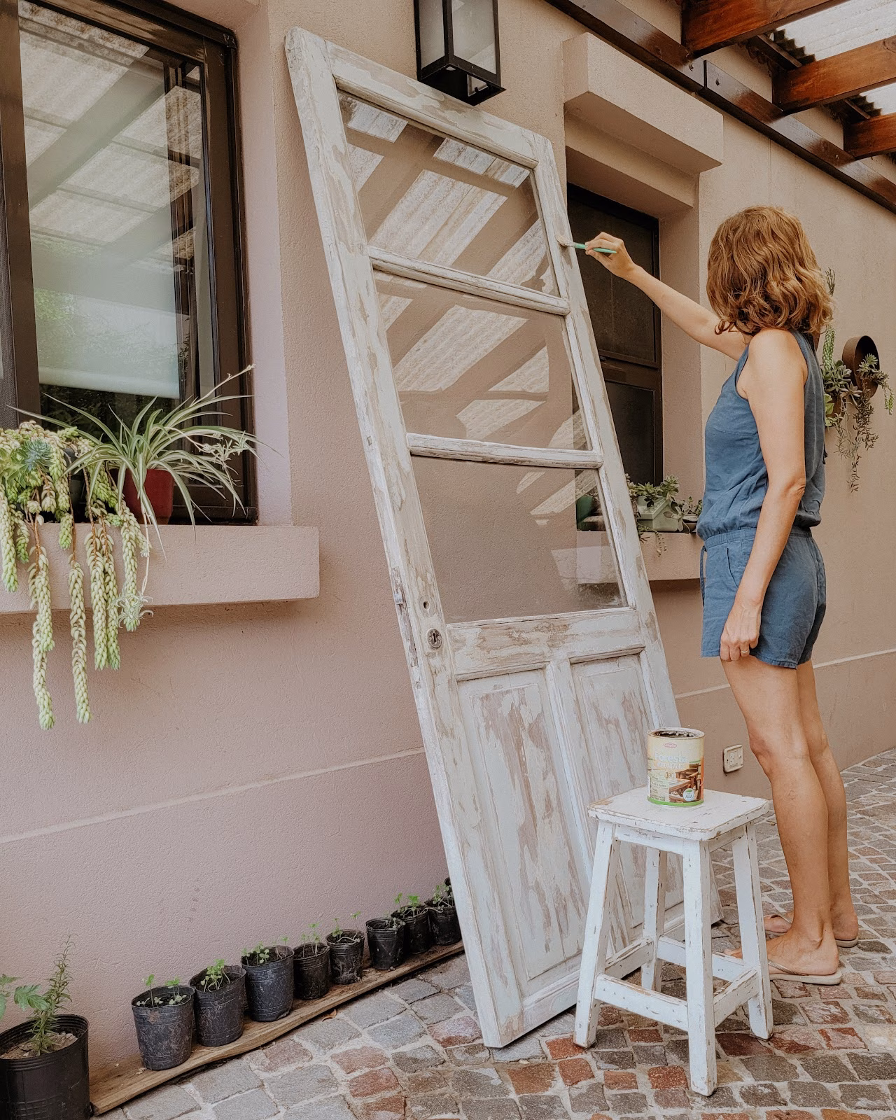 IMPORTANTE: Tengan en cuenta que para el proyecto puerta granero compramos una puerta de demolición. Esta puerta antigua tenía restos de pintura de sus otras vidas. Tuve suerte que eran colores divinos, con un decapado que mantuve en gran parte porque justamente creo era el encanto de una puerta así ♡
