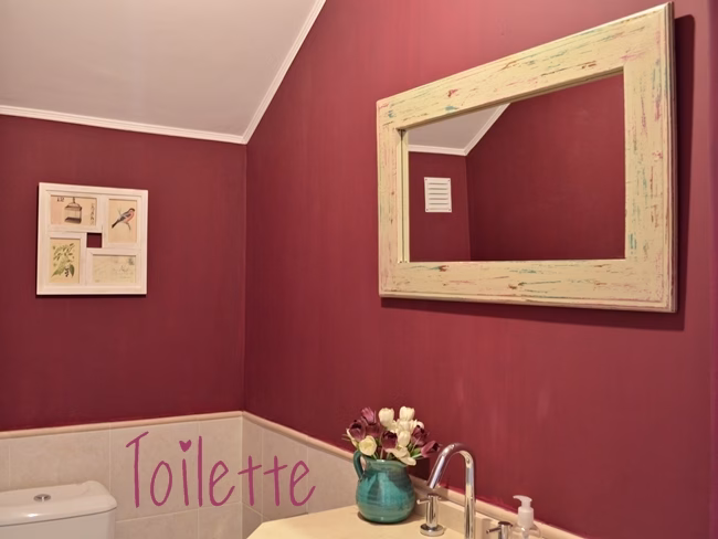 Como me suele pasar… me aburrí! y aunque suene contradictorio, en general me gustan los toilettes, espacios chiquitos y con poca luz muchas veces, pintados de un color intenso. Después del turquesa, me quería correr de los azules y verdes… y hacia rato tenía ganas de algun morado. Así terminé en este «burgundy».