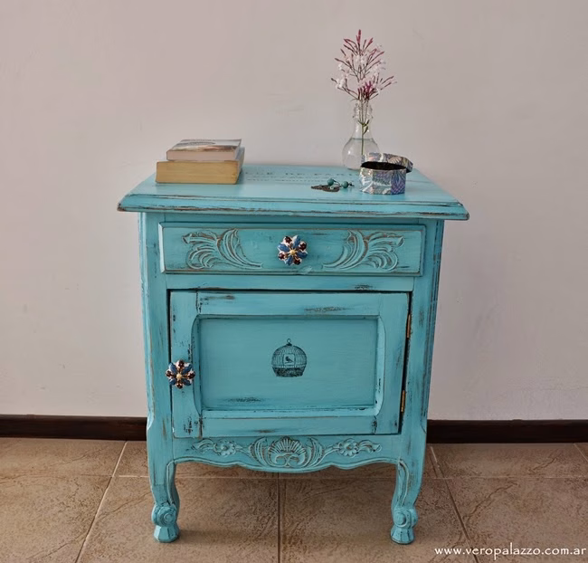 Me consultó por mesas de luz, y justo yo acababa de comprar esta… le encantó y me la pidió en color turquesa, desgastada. Y con alguna imagen vintage…