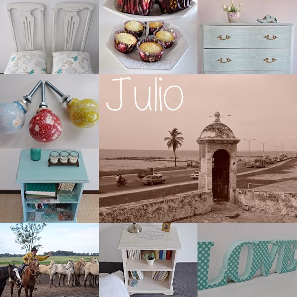 Ya en la segunda mitad del año, llegó Julio con el ojo puesto en los pequeños detalles; le dimos acqua a esta cómoda; les compartía fotos de una ciudad linda linda: Cartagena de Indias; tuvimos un fin de semana con muchos mimos para Oli, peli y cosas ricas; nos confiaron una sillas que se fueron blanquitas derecho al tapicero; más de Cartagena en puertas y ventanas; seguimos con tiradores para «tirar» para arriba!; le dimos nueva vida en celeste a una mesita; festejamos la amistad; les «presenté» a Mimi y ahora somos muchas las que queremos ser como ella :); pintamos a la melliza de la mesita celeste y quedo re linda!; pasamos un día algo gauchesco y en familia; festejamos el día del amigo blogger y se iba Julio a puros lunares!