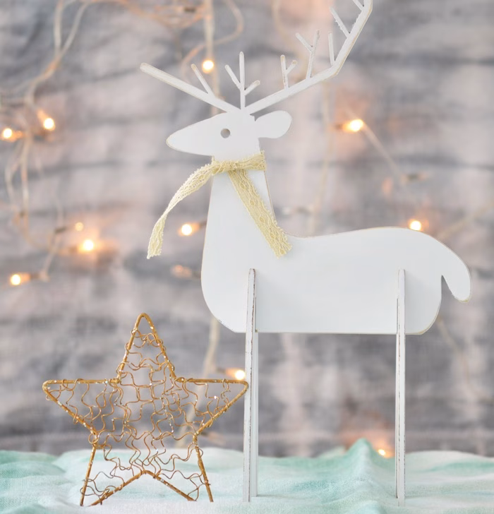 * El ciervito lo compré en una maderera y lo pinté de blanco y desgasté bordes. Me pareció que bufanda de puntillita iba bien para verano 🙂
