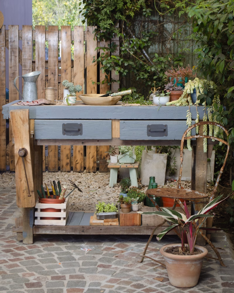 La mesa nos copa a ambos y la verdad que para trabajar, está buenísima! Si bien yo me la imaginé como algo más decorativo más cerca de un rincón botánico que de uno carpinteril… en estos tiempos muchas herramientas y pinceles están teniendo mucho uso por acá.